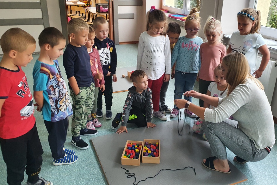 Środa była dniem z „darami Froebla”. Na samym początku dzieci obejrzały teatrzyk kukiełkowy przygotowany przez panią Justynkę. Razem z nią pomogły uciec przed wilkiem trzem małym świnką. Następnie bardzo pilnie pracowały układając obrazki z mozaiki, przeplatając koraliki, budując wieże oraz tworząc korale.