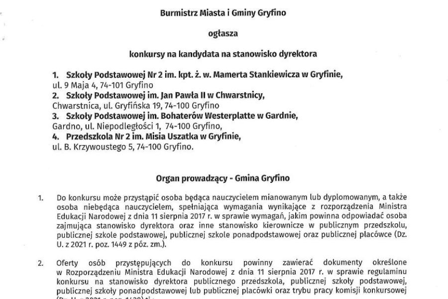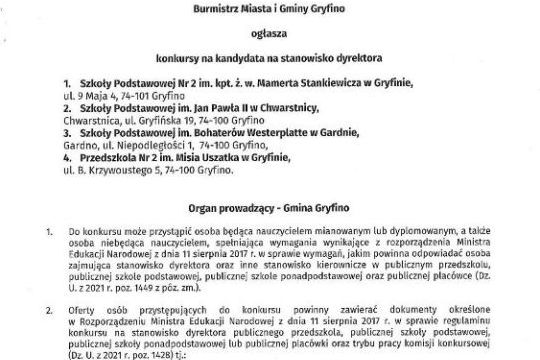 Ogłoszenie - konkurs na kandydata na stanowisko dyrektora Szkoły Muzycznej I stopnia w Gryfinie