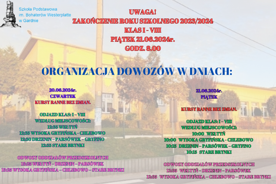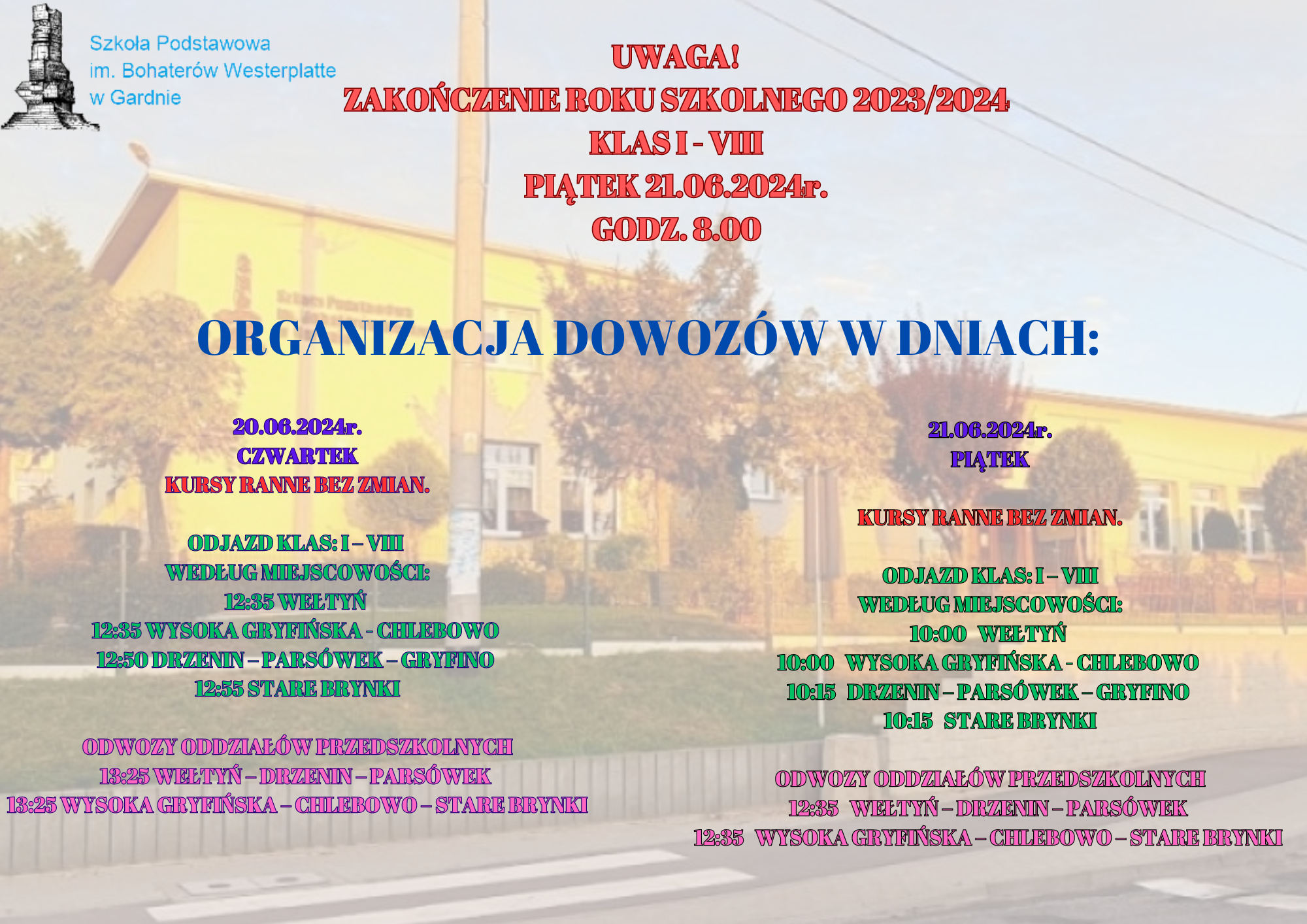 Zarządzenie Burmistrza Miasta i Gminy Gryfino w sprawie ustalenia terminu przerwy w pracy oddziałów przedszkolnych w szkole Podstawowej im. Bohaterów Westerplatte w Gardnie.