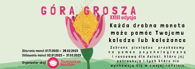 Zapraszamy uczniów, rodziców, nauczycieli i pracowników naszej szkoły do przyłączenia się do ogólnopolskiej akcji „Góra Grosza”, organizowanej w szkołach, uczelniach i przedszkolach w całej Polsce w dniach od 01.11.2022r. do 28.02.2023r.