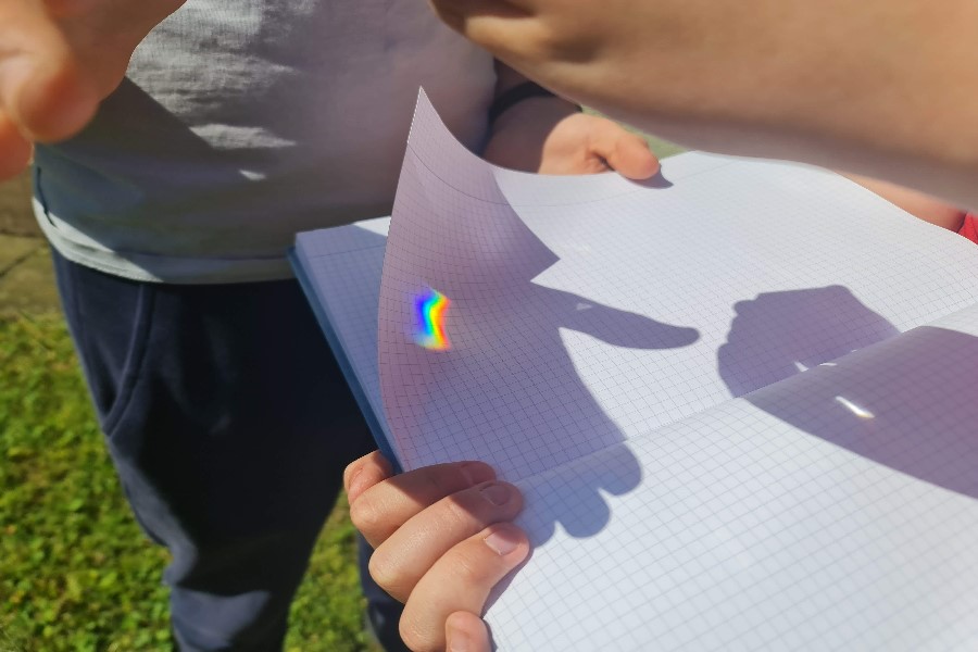 Uczniowie klasy 8a na lekcji fizyki samodzielnie zmierzyli się z zadaniem rozszczepienia światła białego na pryzmacie.