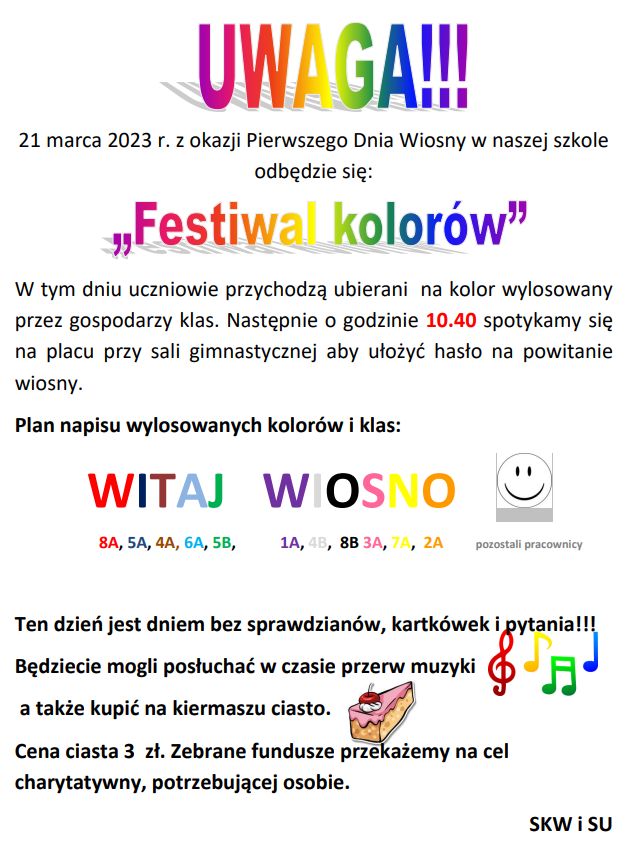 21 marca 2023 r. z okazji Pierwszego Dnia Wiosny w naszej szkole odbędzie się: