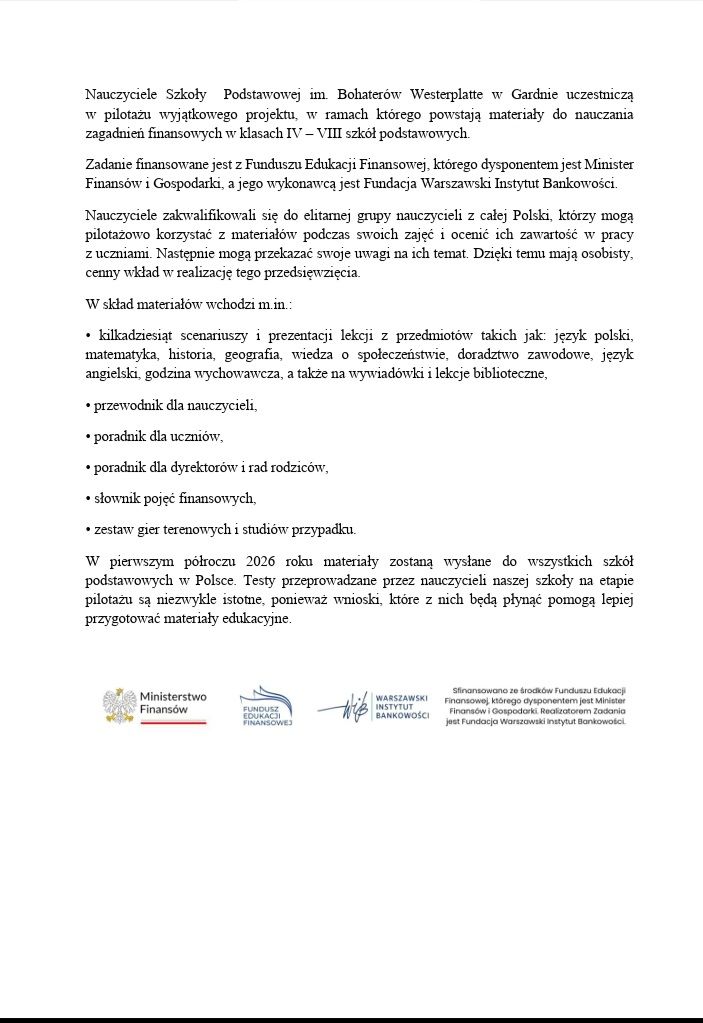 w pilotażu wyjątkowego projektu, w ramach którego powstają materiały do nauczania zagadnień finansowych w klasach IV – VIII szkół podstawowych.