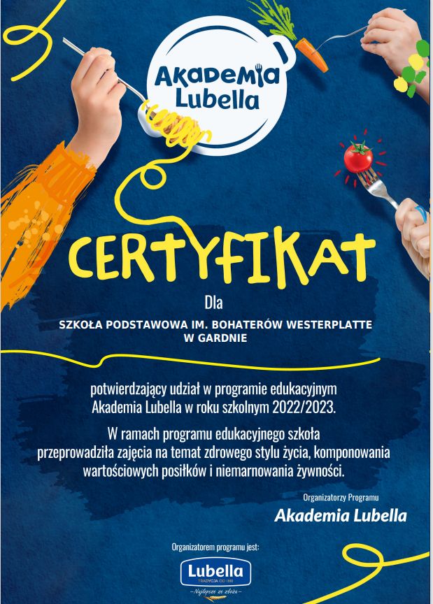 Certyfikat potwierdzający udział w projekcie edukacyjnym Akademia Lubella.