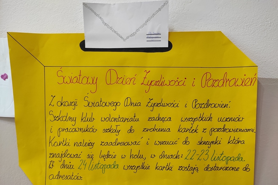 Drodzy uczniowie w dniach 22 - 23 listopada 2021 r na holu w szkole będzie wystawiona skrzynka pozdrowień, do której możecie wrzucać kartki z pozdrowieniami, które na celu mają wywołanie pozytywnych emocji.