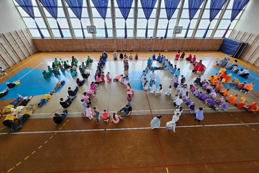 Uczniowie, nauczyciele i pracownicy szkoły z okazji Pierwszego Dnia Wiosny wzięli udział w Festiwalu Kolorów przygotowanym przez Szkolny Klub Wolontariatu i Samorząd Uczniowski.